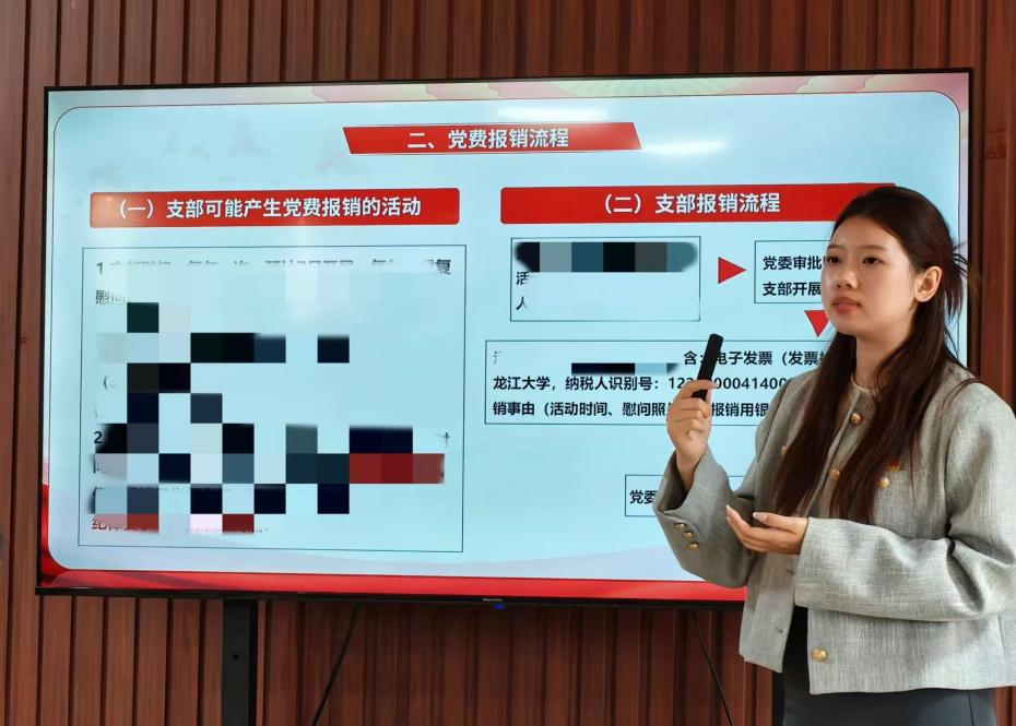 随后,由离退休工作处组织员王硕为全体支委作了题为《规范党费收缴使用管理、夯实党建工作基础》的专题辅导。王硕结合上级文件要求和工作实际,详细讲解了党费计算基数、收缴比例、使用范围和报销流程等具体规定和要求,并对工作中容易出现的模糊点和注意事项进行了重点强调和说明。