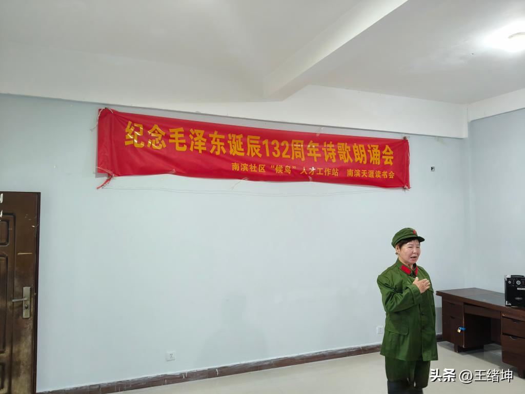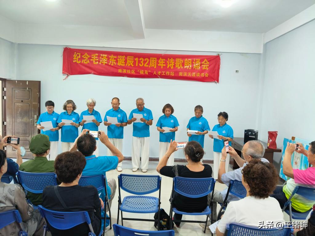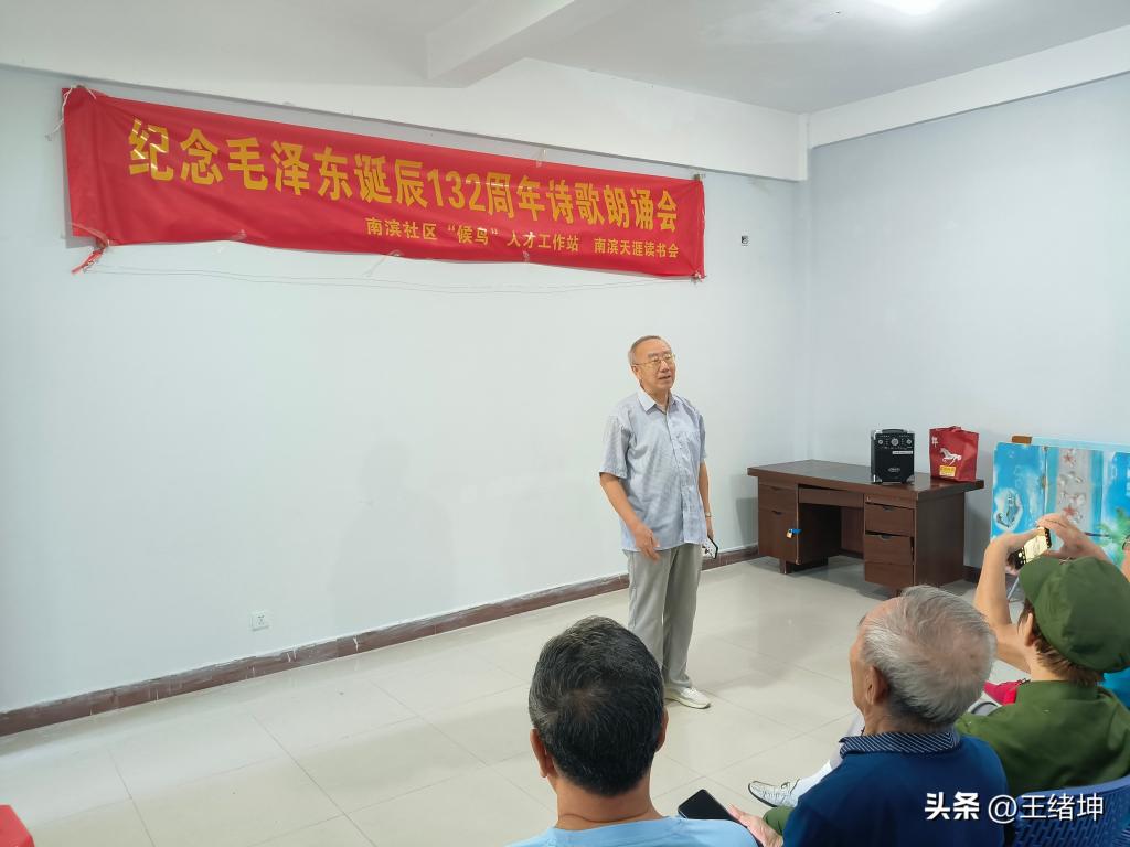 12月25日上午,三亚市崖州区南滨花园内掌声阵阵、深情涌动,一场由南滨社区“候鸟”人才工作站、天涯读书会发起,黑大三亚临时党支部、呼兰区老干部局三亚流动党支部、哈尔滨市场局三亚流动党支部及三亚异地养老协会崖州联合分会共同参与的纪念毛泽东诞辰132周年诗歌朗诵会隆重举行。一群古稀、耄耋之年的“候鸟”老同志齐聚一堂,以诗为媒、以歌传情,缅怀伟人风范,歌颂丰功伟绩。